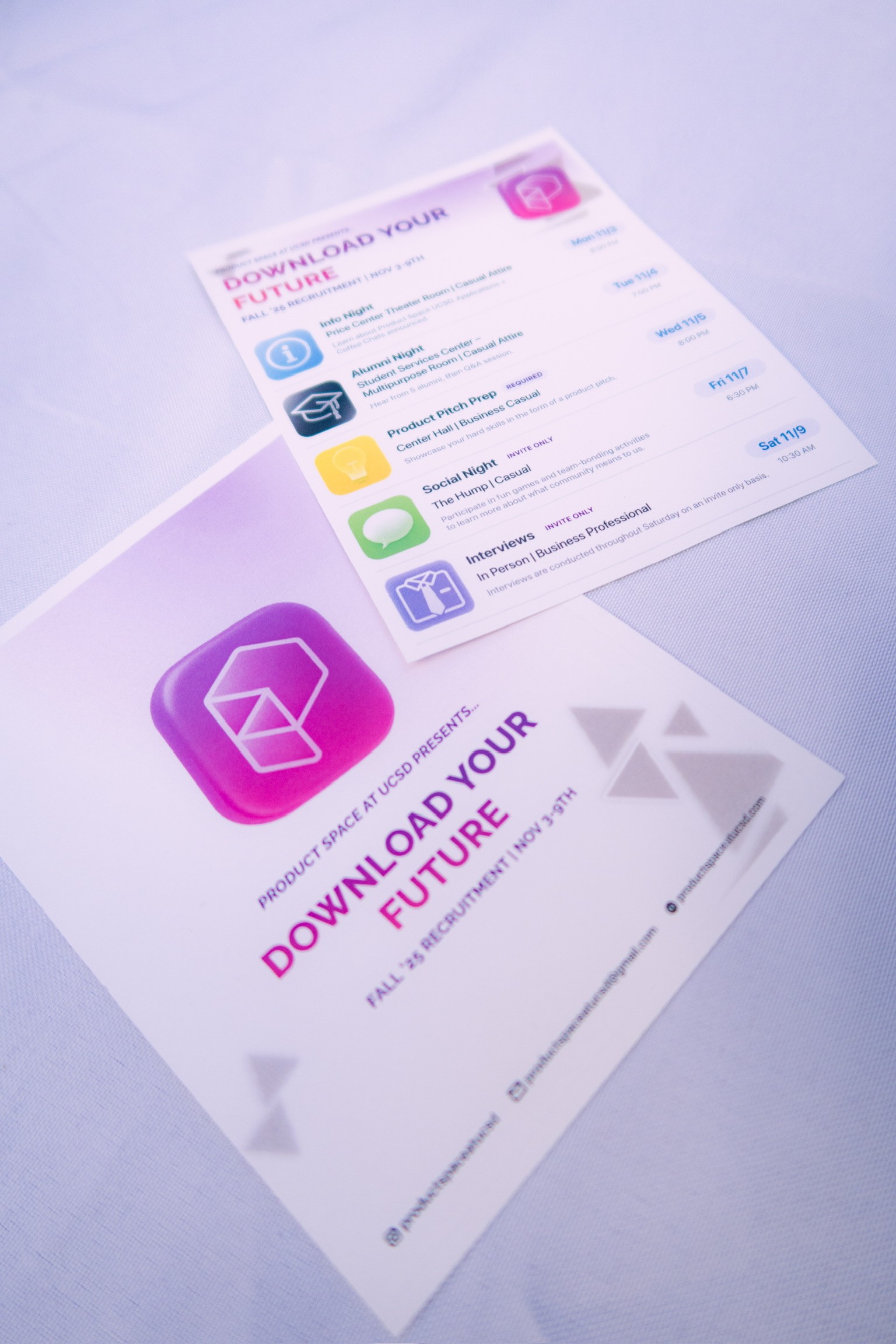Our fellowship program is a two quarter mentorship program where fellows will complete weekly workshops hosted by experienced board members in Winter quarter, and complete a capstone project in Spring quarter to showcase their learning and experience firsthand the interactions between product marketing, management, and design.